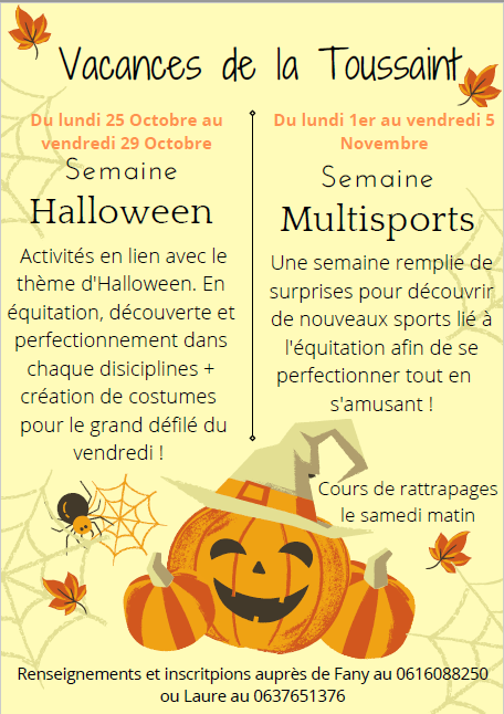 Au programme : Equitation tout les jours avec plusieurs séances à thème, activités autour du poney sur le thème d’Halloween, préparation des costumes des cavaliers et des poneys pour le grand défilé du vendredi après-midi !!